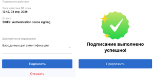 В открывшемся окне приложения eGov нажмите на кнопку «Подписать» и пройдите идентификацию пользователя. При появлении сообщения: «Подписание выполнено успешно» затем нажмите на кнопку «Продолжить». После нажатия кнопки будет выполнен возврат в приложение Telegram.