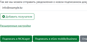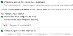 Кликните на галочку и введите ИИН или БИН получателя. Контрагент сможет увидеть и подписать отправленный документ в личном кабинете на https://sigex.kz и в Telegram боте SIGEX.