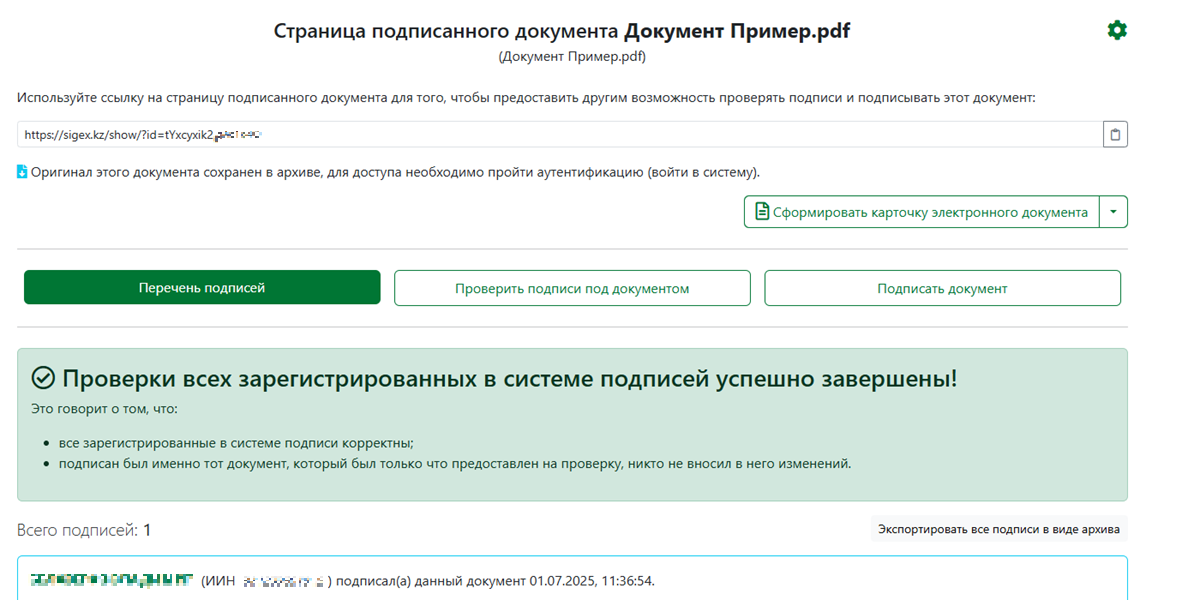 Удостоверьтесь в том, что сервис отобразит успешный результат проверки подписи.